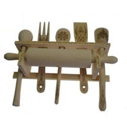 Ce set en bois décoré à chaud avec étagère comprenant 6 ustensiles trouvera parfaitement sa place dans votre cuisine ! Pour une cuisine de qualité, rien de mieux que la simplicité ! Dans le set en bois, vous trouverez : 2 pilons, 1 fourchette, 1 cuillère à sauce, 1 spatule et un rouleau à pâtisserie