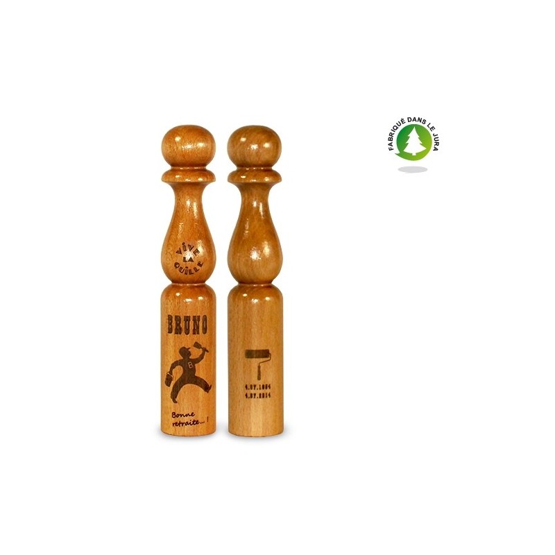 Une quille de retraite en bois fabriquée et gravée en France, dans le Jura.